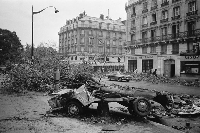 Изплашени до смърт минувачи търсят подслон в кафенета и магазини. От прозорците им се вижда как разярената парижка тълпа преобръща и пали коли. Хвърчат камъни и бутилки, а тропотът на полицейските палки по щитовете на униформените прави уличната война още по-смразяваща кръвта.