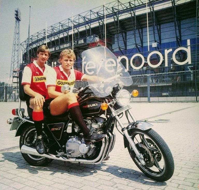 Кройф и Хаутман на мотор пред стадиона на Фейенорд.