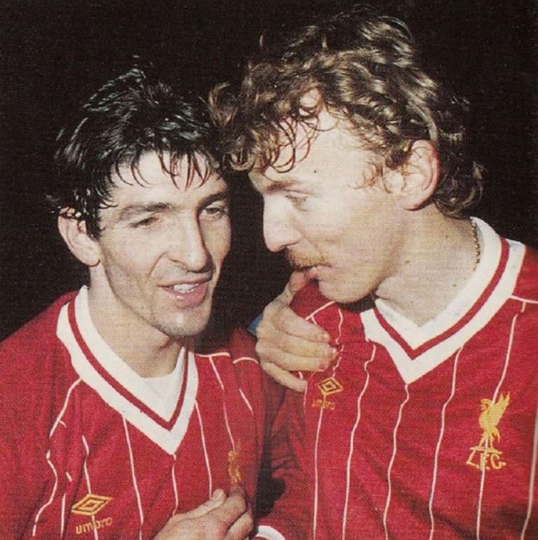 1985 г. Паоло Роси и Збигнев Бонек от Ювентус с екипа на Ливърпул след победата с 2:0 за Суперкупата на Европа - само месеци преди трагедията на "Хейзел".