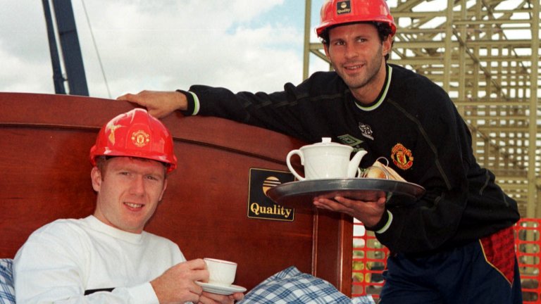 Райън Гигс поднася английска закуска и чай на Пол Скоулс в леглото в, може би, някаква реклама на хотел или на строителна компания, който е бил спонсор на Манчестър Юнайтед през годините.