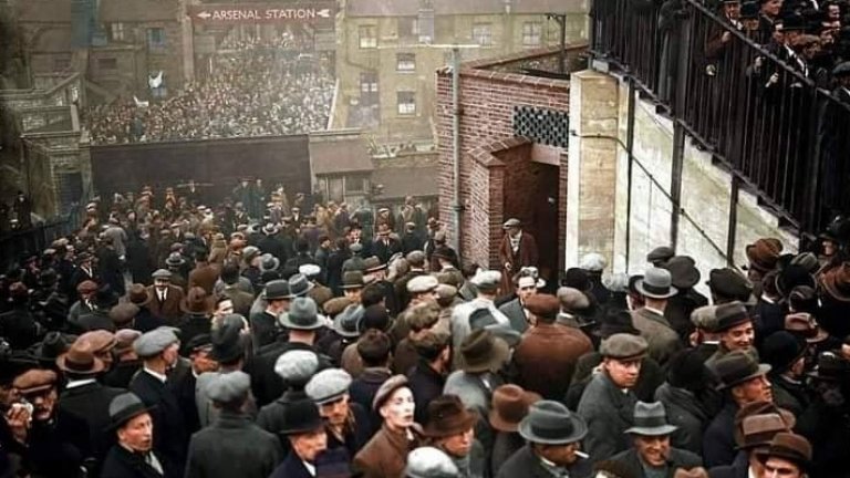 В началото и средата на миналия век по стадионите в Англия почти няма "гологлави" зрители. Снимката е от домакински мач на Арсенал на "Хайбъри" през 1934 г.