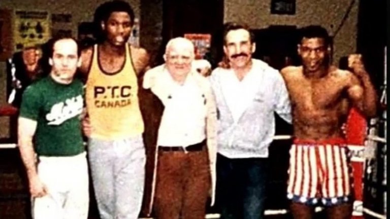 Ленъкс Люис (16 г.) и Майк Тайсън (15 г.) с Къс Д'Амато след спаринг помежду си 20 години преди да се изправят един срещу друг на ринга официално, вече като истински величия в боса. Снимката е правена в нюйоркска зала през 1982 г.
