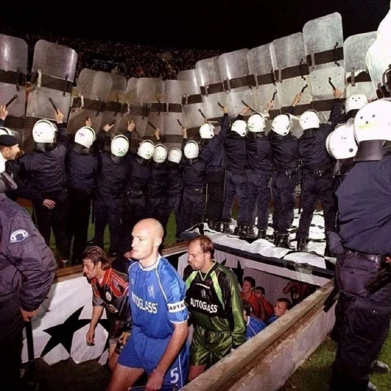 Полицейски кордон с щитове пази футболистите на Галатасарай и Челси през 2001 г. Турските фенове са сред най-лудите в света.