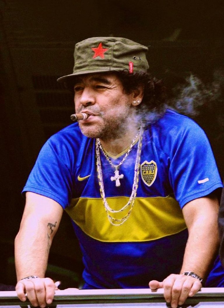 Великият Диего Марадона като своя идол Фидел Кастро - с пура в устата и със зелената шапка с червената петолъчка. Аржентинският гений обожаваше Кастро, наричаше го втори баща и дори имаше татус с неговия лик на крака, на рамото се бе изрисувал с Че Гевара.
