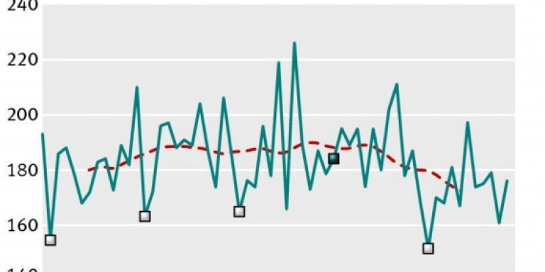 На графиката по-долу сивите квадратчета отбелязват месец февруари на съответните години, а черно-зеленото - февруари 2010 г.