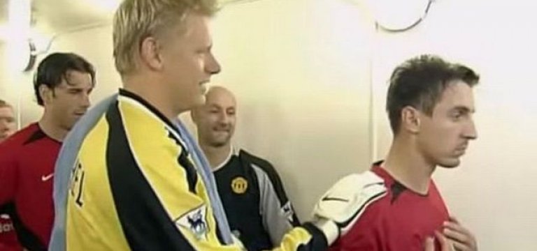 В тунела преди дербито е доста напечено. Шмайхел се усмихва и си разменя любезности с Райън Гигс, след което решава да подаде ръка на капитана на Юнайтед Гари Невил. Бранителят обаче презрително извръща глава и се прави, че не забелязва бившия си съотборник, отвратен от предателството му.