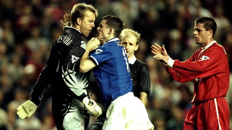 Perhaps his best moment in an Everton shirt - having a good old scrap with Sander Westerveld in the Merseyside Derby.