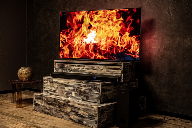 Имате нужда от HDMI кабел (присъстващ в кутията) и 2 контакта за включването на колоните (събрани в саундбара) и буфера. Последният работи безжично и може да се позиционира по-далеч от телевизора, спестявайки допълнителното преплитане на кабели.
