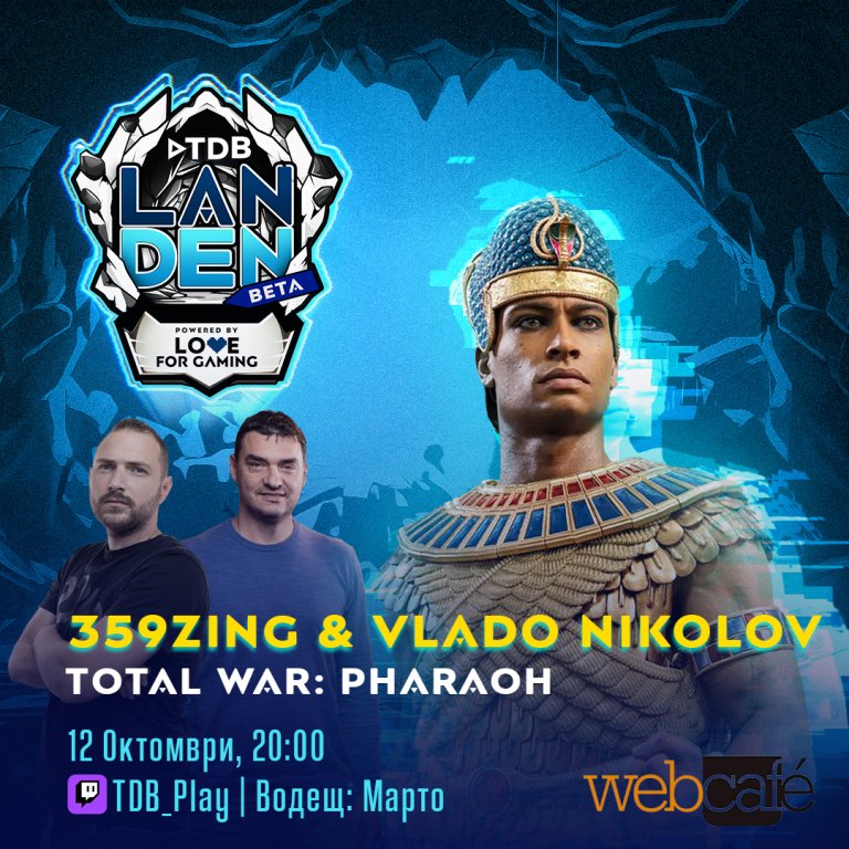Водещ на събитието от поредицата TDB Lan Den ще бъде една от легендите на българския гейминг и създател на TDB Play Мартин Кадинов, а на гости ще му бъдат опитният геймър Александър Ананиев - Zing, волейболната звезда Владо Николов, както и хората с пряка отговорност новата игра да се случи - Алекс Георгиев, Lead Game Designer на Total War: PHARAOH, и Милчо Василев, Lead Battle Team.