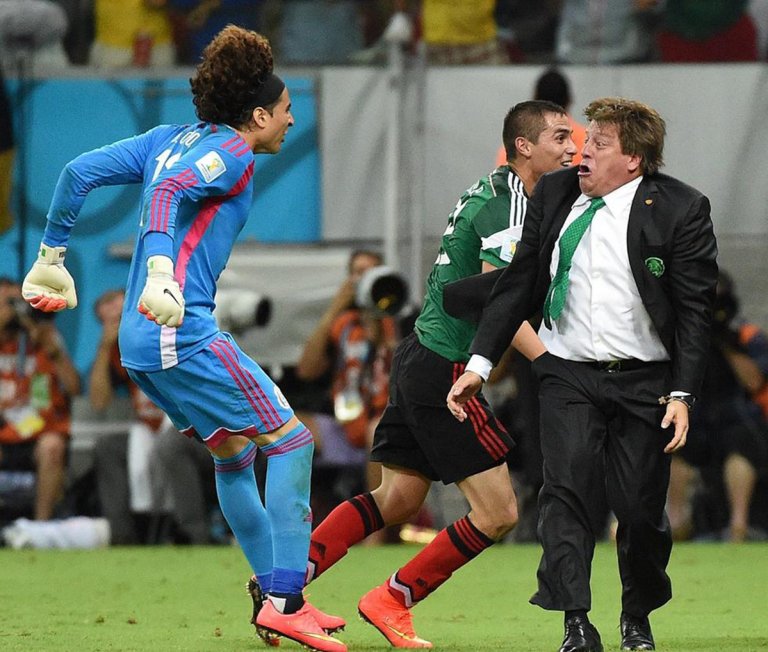 Селекционерът на Мексико Мигел Ерера празнува по неговия си начин гола срещу Хърватия на световното. Снимката е от 23 юни 2014 г.