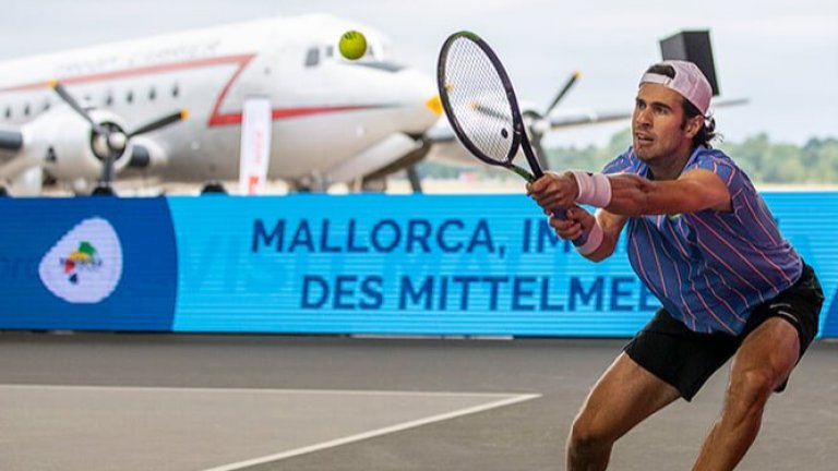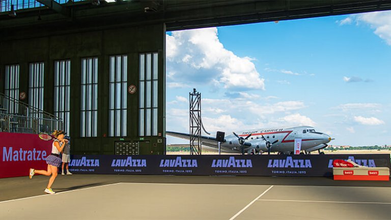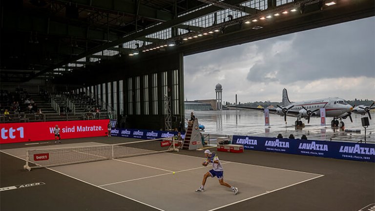 Този, който хвана окото на феновете и естетите обаче, бе другият, който започна в петък. За негова арена бе избрана една от най-нетипичните за тениса обстановки - огромен хангар на летище в един от кварталите на Берлин - Темпелхоф.