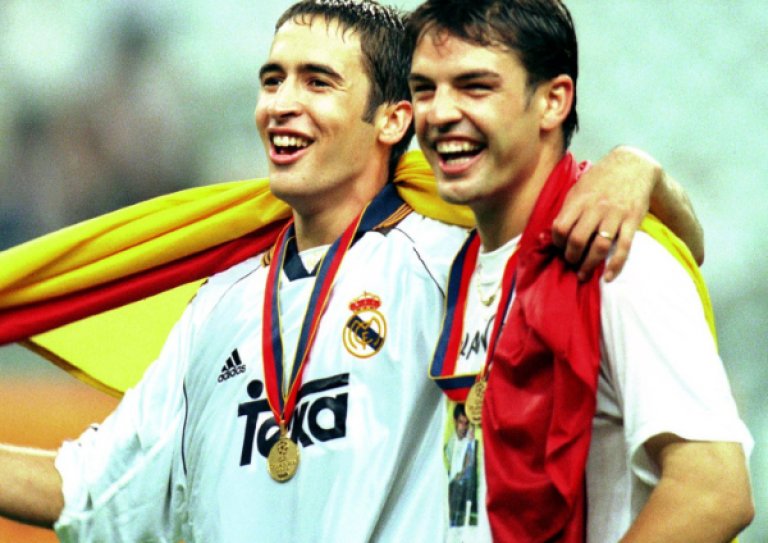 Раул Гонсалес и Фернандо Мориентес след спечелването на Шампионската лига от Реал Мадрид през 2000 г. след финал, в който и двамата вкараха по един гол.
