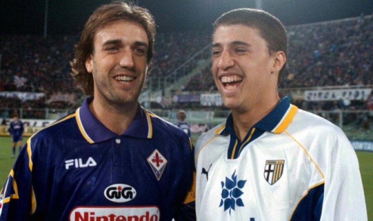 Двама страхотни аржентинци на среща в Италия. Габриел Батистута с екипа на Фиорентина и Ернан Креспо с фланелката на Парма.