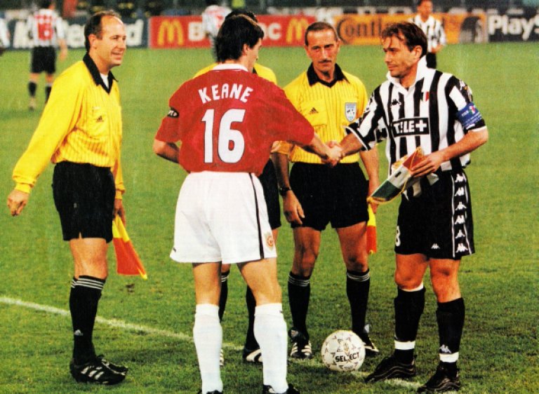 Капитани! Рой Кийн от Манчестър Юнайтед и Антонио Конте от Ювентус преди полуфинала в Шампионската лига през сезон 1998/99.
