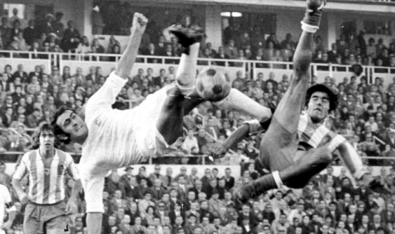 Пири от Реал Мадрид и Монреал от Малага едновременно се опитват да направят задна ножица.