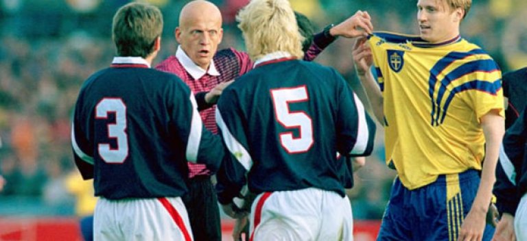 Съдията Колина към Колин Хендри: "Видях те! Ето така дръпна Кенет Андерсон за фланелката."