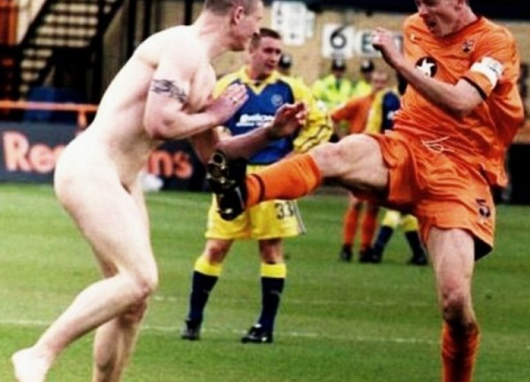 Мъжки времена! Грег Хелд от Барнет се опитва да изгони с шут натрапник, нахлул гол на терена.