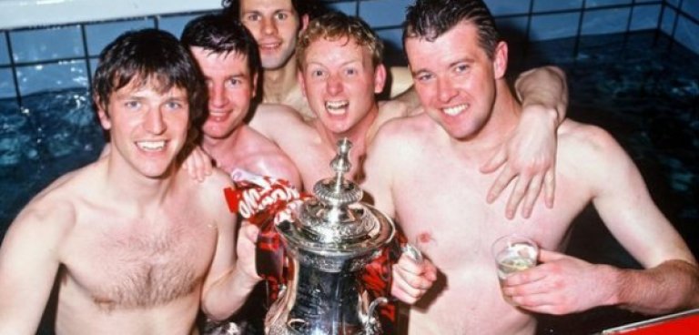 Шарп, Ъруин, Гигс, Мей и Палистър празнуват спечелената от Манчестър Юнайтед ФА къп през 1996-а.