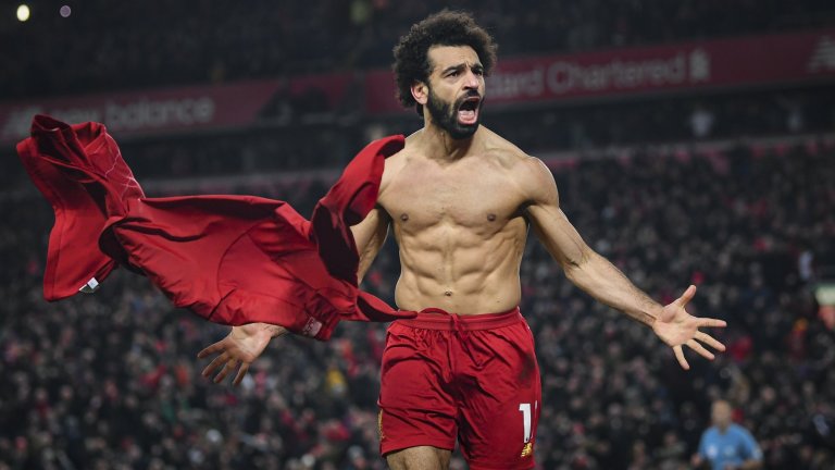Мохамед Салах е свалил фланелката си в еуфорията след отбелязването на гол при победата с 2:0 над Манчестър Юнайтед на "Анфийлд".