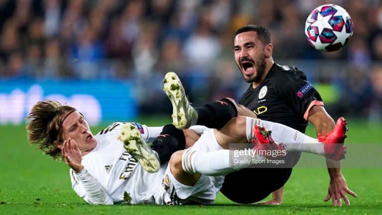 Близка среща между Лука Модрич и Илкай Гюндоган по време на първия мач от осминафиналите в Шампионската лига между Реал Мадрид и Манчестър Сити.