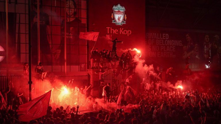Хиляди фенове на Ливърпул нарушават противоепидемичните правила и се струпват пред "Анфийлд", за да отпразнуват първата шампионска титла на клуба от 30 години насам.