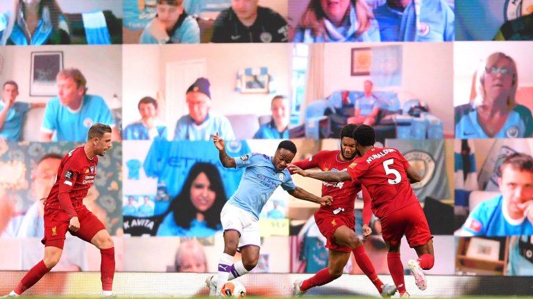 Рахийм Стърлинг печели дузпа за Манчестър Сити срещу Ливърпул, наблюдаван зорко от феновете на своя тим - която остават близо до отбора благодарение на огромната видеостена, разположена до терена.