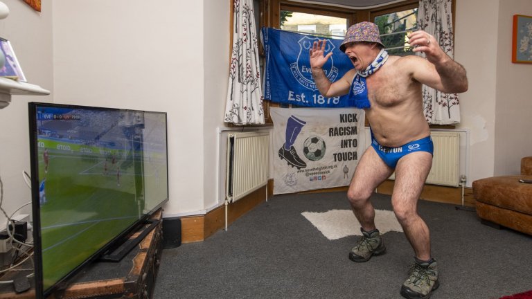 Стадионите в Европа все още са затворени и прочутият фен на Евертън Майкъл Кулън е принуден да наблюдава дербито срещу Ливърпул у дома пред телевизора.