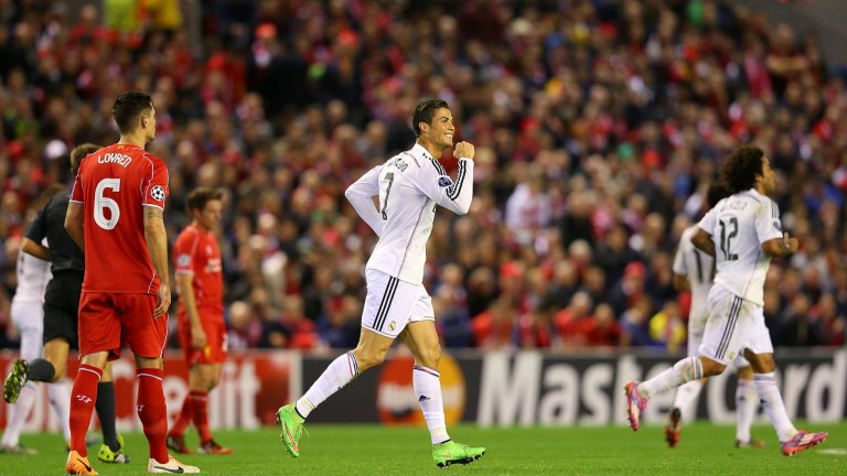 Пет години по-късно историята бе доста по-различна. Реал "разкова" тима на Брендън Роджърс насред "Анфийлд" в рамките на само 18 минути през първата част. Фантастичен гол на Кристиано Роналдо, последван от два на Карим Бензема бързо решиха всичко.