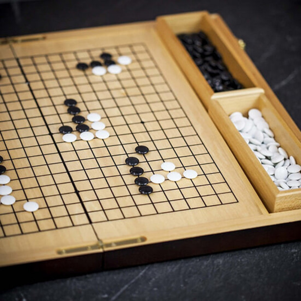 Но при Го този подход не работи поради огромното количество данни, които трябва да бъдат обработени. Върху дъската за Го е начертана квадратна решетка от линии. Официалният размер на решетката е 19x19 линии, но правилата могат да се прилагат за всякакви размери. За начинаещи играчи се препоръчват малки дъски с размер 9х9 или 13x13 линии, а напредналите, както и професионалистите, играят на 19х19. Играе се с фигури, които представляват бели и черни камъчета. Те се поставят върху пресечните точки на линиите.