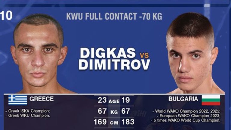 Сега 19-годишният боец от Добрич, който е двукратен световен шампион на WAKO, ще се изправи срещу друг представител на гръцката школа Харалампос Дигкас - шампион по кикбокс на Гърция на ISKA и WKU.
