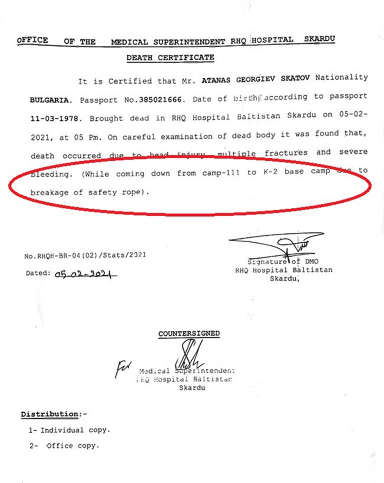 Твърденията, че грешка на Атанас Скатов е основната причина за смъртта на българския алпинист, бяха опровергани от официалните документи. Скатов загина на 5 февруари при слизане от Лагер 3 под К2.