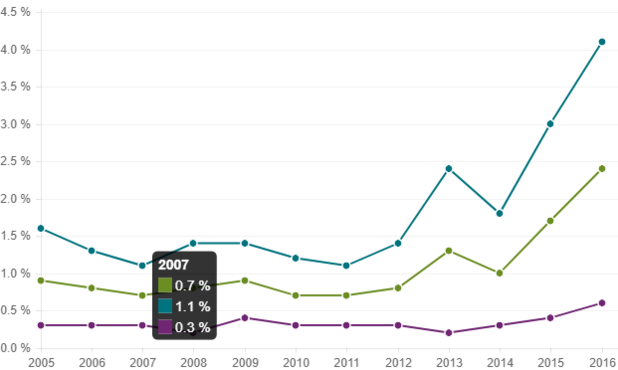 Междувременно за 2012 г. 0,8% от цялото население на страната (и 1,4% от жените) е обявило, че е жертва на престъпления от сексуален характер. За 2013 г. делът се покачва до 1,3% за цялото население (2,4% при жените), 2014 г. - 1% от населението (1,8% при жените), 2015 г. - 1,7% от населението (3% при жените) и за 2016 г. - 2,4% от населението (4,1% при жените). Според NTU през 2016 г. става въпрос за около 181 хил. души.