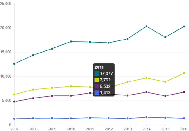 Така през 2007 г. броят на всички сексуални престъпления е бил 12 563, от които 4749 изнасилвания, през 2008 г. - 14 342 сексуални престъпления (5446 изнасилвания), 2009 г. - 15 693 сексуални престъпления (5937 изнасилвания), 2010 г. - 17 167 сексуални престъпления (5960 изнасилвания), 2011 - 17 077 сексуални престъпления (6532 изнасилвания), 2012 г. - 16 923 сексуални престъпления (6324 изнасилвания), 2013 г. - 17 704 сексуални престъпления (6017 изнасилвания), 2014 г. - 20 326 сексуални престъпления (6697 изнасилвания), 2015 г. - 18 057 сексуални престъпления (5918 изнасилвания) и 2016 г. - 20 284 сексуални престъпления (6715 изнасилвания).