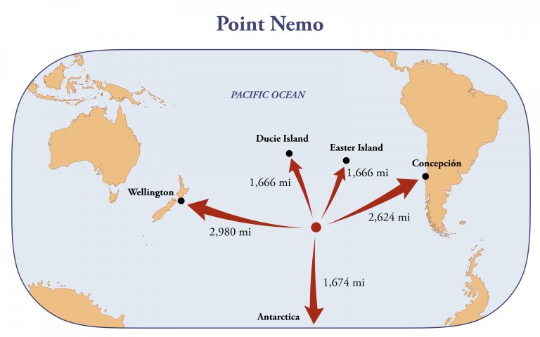 В случая Пойнт Немо е най-отдалечената точка от която и да е суша. Най-близката земя се намира на около 2700 километра и представлява необитаемо островче. Най-близката населена земя пък е още по-далеч - Чили е на повече от 4200 км в източна посока.