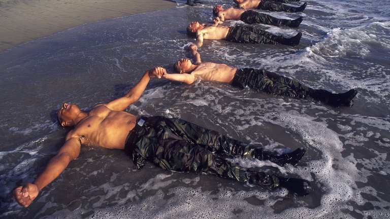 Едно от най-тежките изпитания обаче е носене на лодка. При него екип от шестима души носи върху главите си 150-килограмова надуваема лодка в продължение на няколко километра.