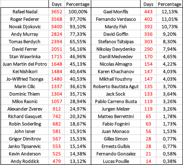 В челото на класацията са тримата големи Рафаел Надал, Роджър Федерер и Новак Джокович. Испанецът е единственият, който изобщо не е изпадал от топ 10 през целия 10-годишен период.