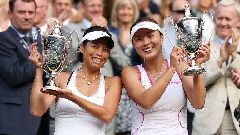 Шуай Пън (вдясно) заедно с партньорката си Су-Уей Сие с титлата от двойковия турнир на Уимбълдън през 2013 г.