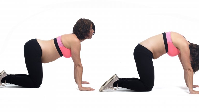 Ако офисът ви позволява или сте вкъщи, направете "котешки гръб". Застанете на колене на пода, вдишайте и изпънете главата нагоре. Извийте кръста надолу. Издишвайки, наведете главата и извийте гърба в обратна посока. Повторете 10 пъти.