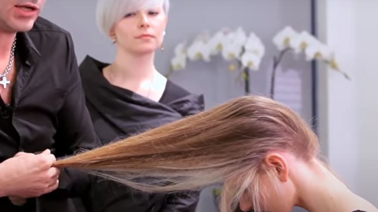 Цялата коса трябва да е събрана идеално. Махате ластика без да разбърквате косата, като я държите с ръка. Идеята е махайки го, косата да остане така събрана в ръката ви и да я задържите при проблемните краища.