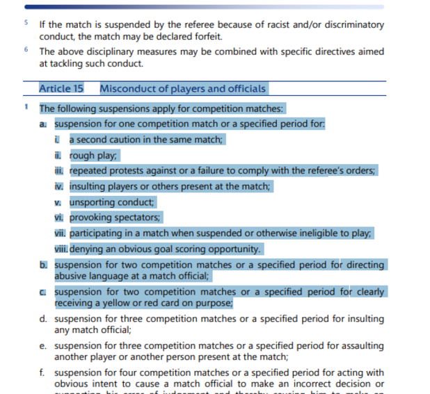 Това ясно е записано в Дисциплинарния правилник на УЕФА. Става въпрос за чл. 15 ал. 2c, според който се предвижда наказание от две или повече срещи за умишлено изкарване на жълт или червен картон от страна на футболист.