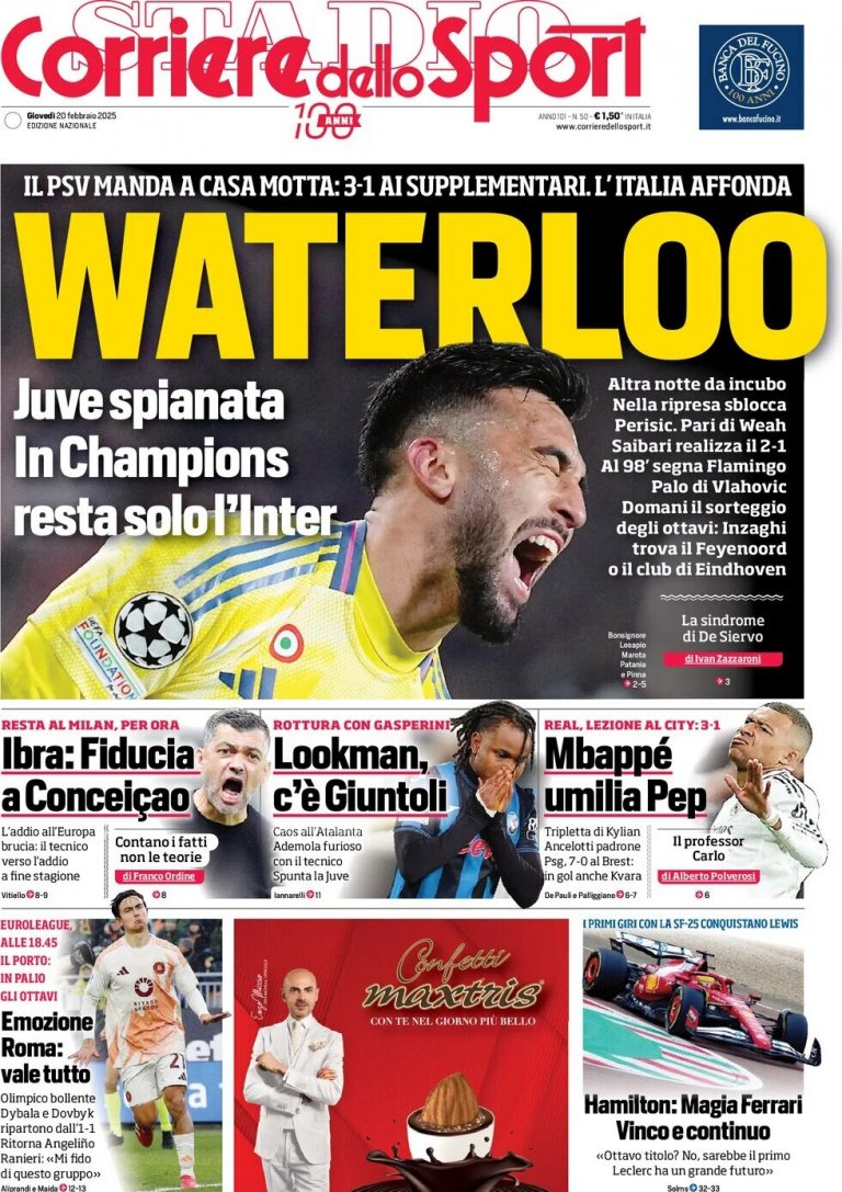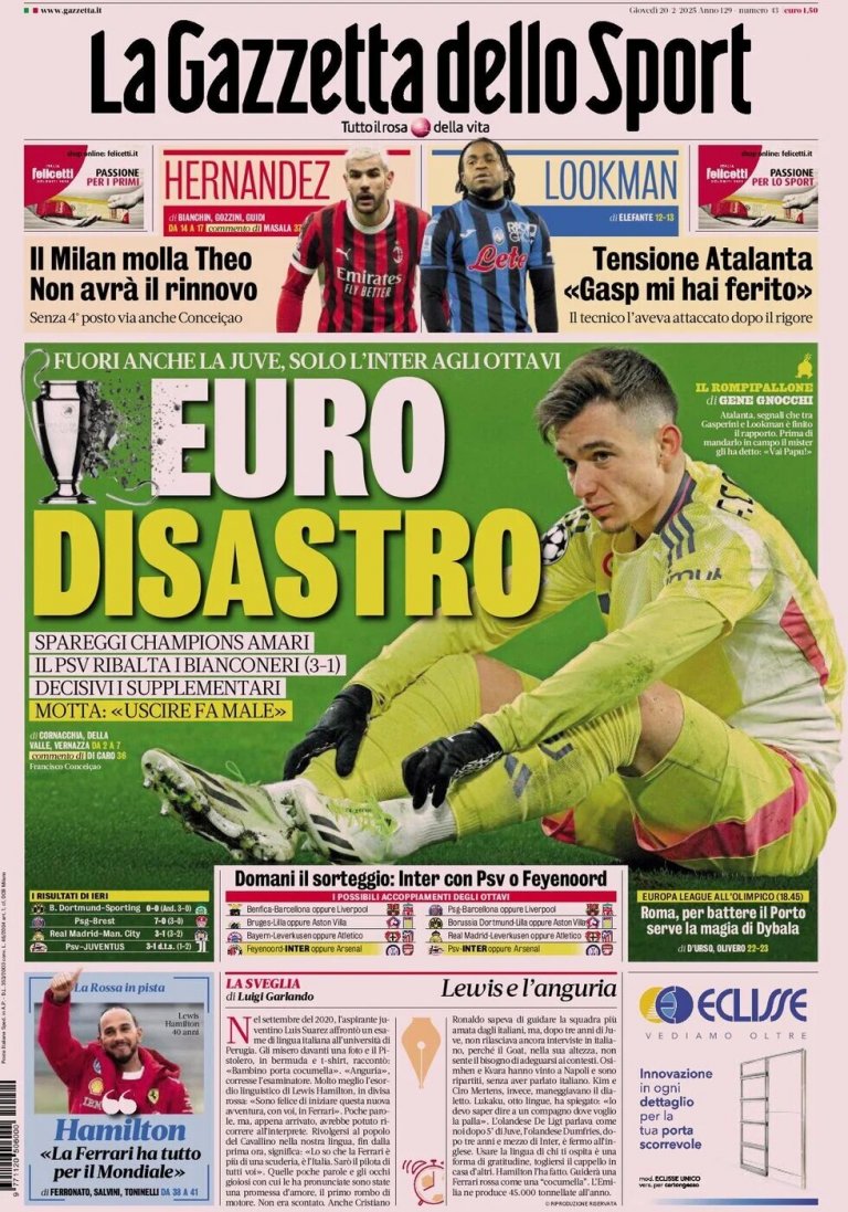 "Европейска катастрофа. Ювентус също е аут. Кошмарни плейофи в Шампионската лига", отбелязва "Гадзета дело Спорт".