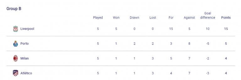 Ливърпул е с пълен актив от точки след първите пет мача и е сигурен първенец на групата, докато за останалите три отбора последният кръг ще бъде битка на живот и смърт. Порто и Атлетико се изправят един срещу друг в директен сблъсък за втората позиция, докато "росонерите" ще се надяват Юрген Клоп да даде почивка на голяма част от титулярите си. Единственият шанс за класиране на Милан е победа срещу Ливърпул и Порто да не бие "дюшекчиите" на Диего Симеоне.