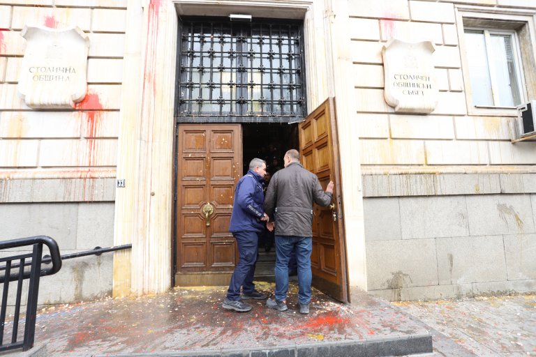 Сградата на общината беше замервана с яйца и червена боя.