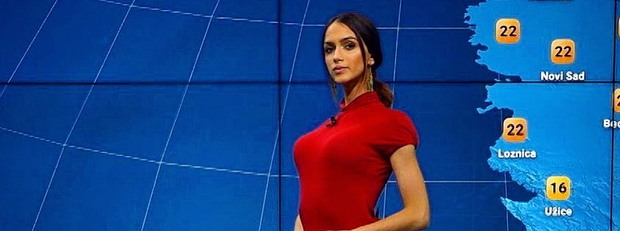 Красивата синоптичка Сара Дамянович като на шега видгна десния крак над главата си и изрита подхвърлена от оператора топка, докато четеше прогнозата за времето.