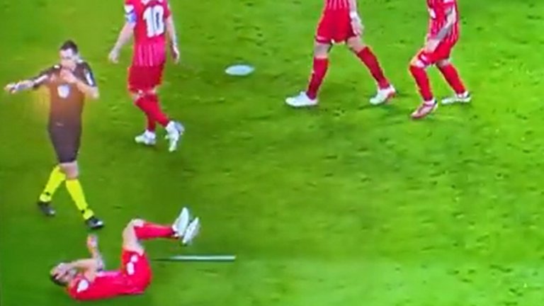 Докато играчите на домакините празнуваха, техен привърженик реши да метне към терена дълъг прът, който уцели Жордан и развали футболния празник.