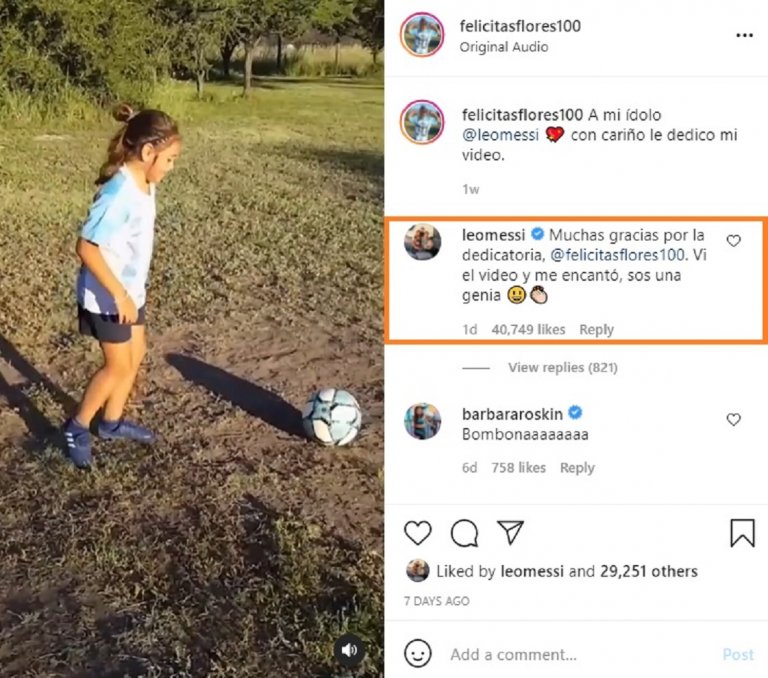 Фелиситас Флорес публикува видео в Instagram със заглавие: "На моя идол Лионел Меси. Посвещавам ти това видео с най-топли чувства."