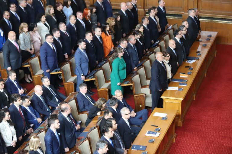 След удрянето на първия звънец и полагането на клетвата прозвучаха химните на България и Европейския съюз (ЕС). По време на химна на ЕС депутатите на "Възраждане" демонстративно седнаха.