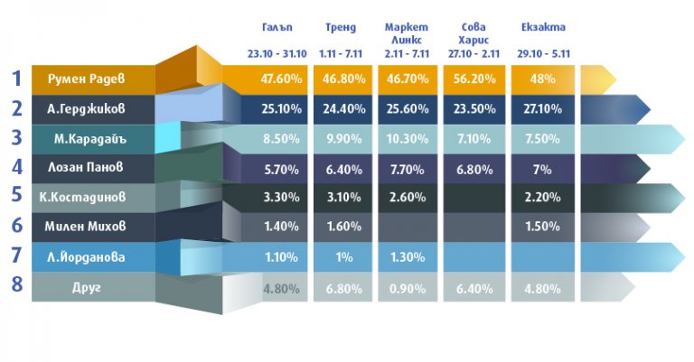 Всички тези изследвания са единодушни в подреждането на кандидатите. Румен Радев е първи, следван от независимия проф. Анастас Герджиков, подкрепен от ГЕРБ, лидера на ДПС Мустафа Карадайъ, независимия Лозан Панов, ползващ се с подкрепата на "Демократична България", и Костадин Костадинов от "Възраждане".
