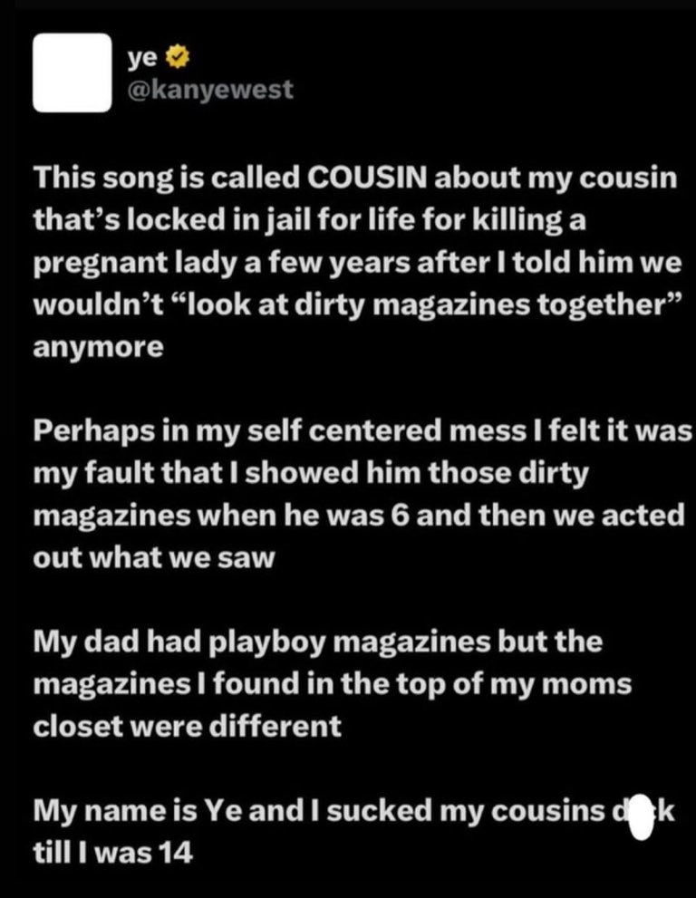 Уест завършва с признанието, че докато е станал на 14, е "смукал" гениталиите на братовчед си.