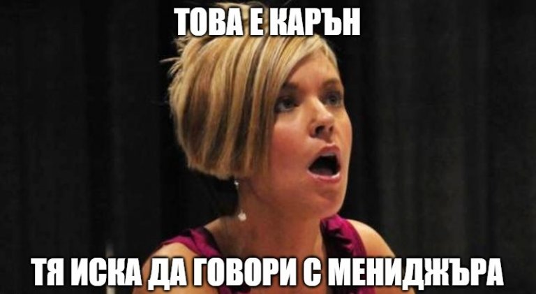 Напротив, то стига до все повече краища на света, защото, нека бъдем откровени, във всяка държава има подобни типажи. Дори не е сигурно къде за първи път се появяват колажите с Карън - в Reddit, в 9gag или в друг подобен сайт. Сега във всяка от тези платформи почти ежедневно има някой бъзик с русата жена с прическа на каре, която иска да говори с мениджъра.